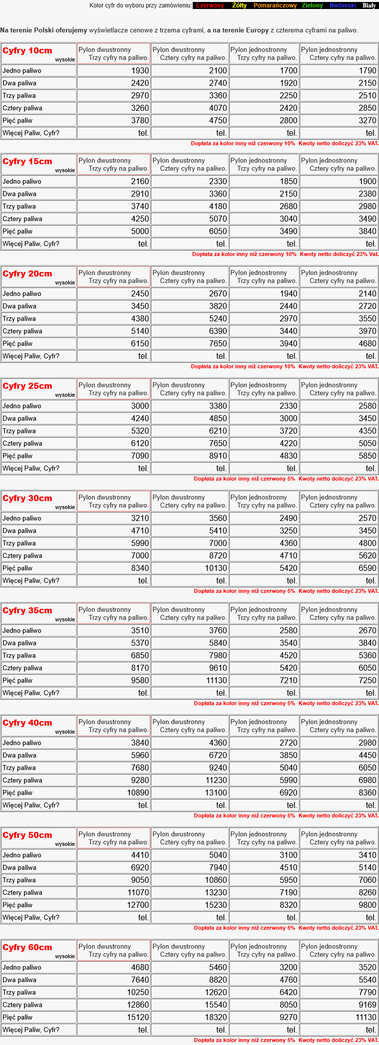 Cennik wyświetlaczy cenowych LED do pylonów cenowych.